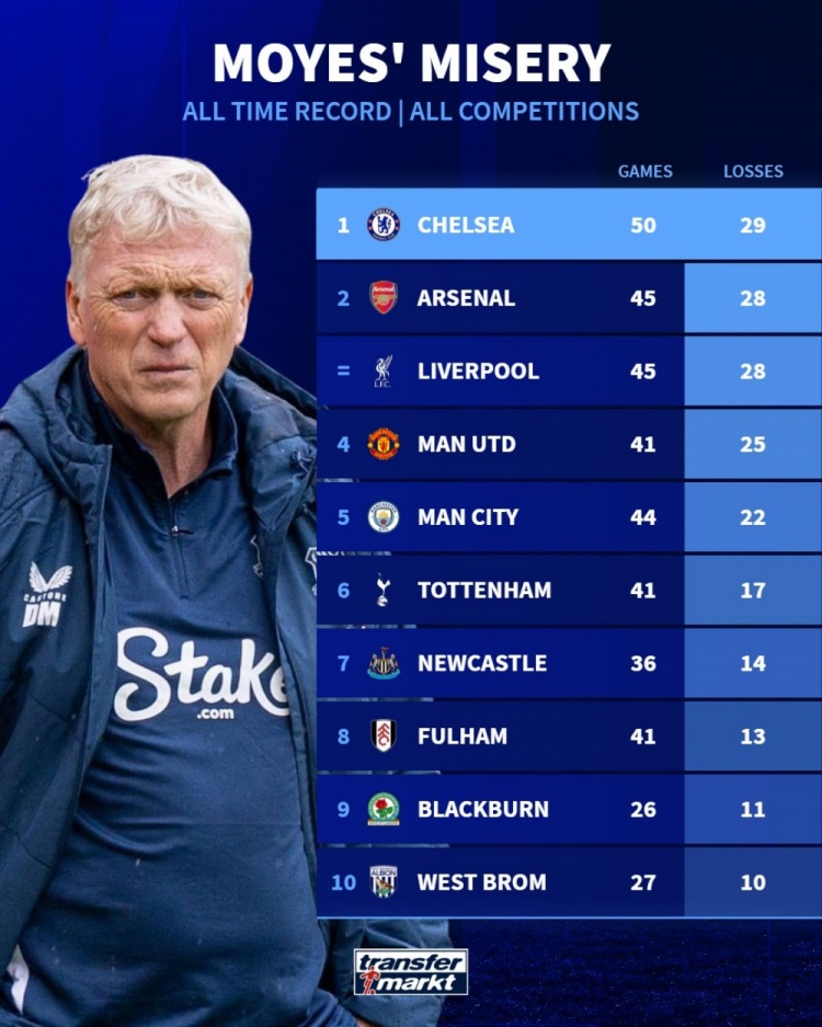 12月14日讯 英超第16轮比赛,埃弗顿客场0-2不敌切尔西,德国转会市场统计了莫耶斯执教生涯输给不同对手的场次,并列出榜单。