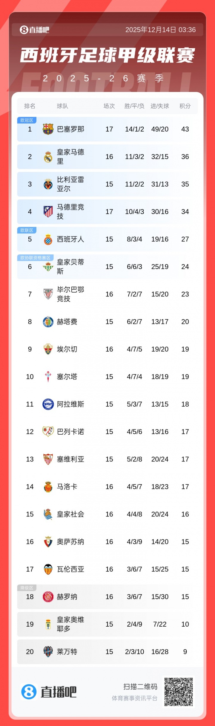 12月14日讯 西甲第16轮,巴萨2-0奥萨苏纳。最新的积分榜方面:巴萨先赛7分优势领跑,第2的皇马明日凌晨客战阿拉维斯,黄潜第3,马竞第4。